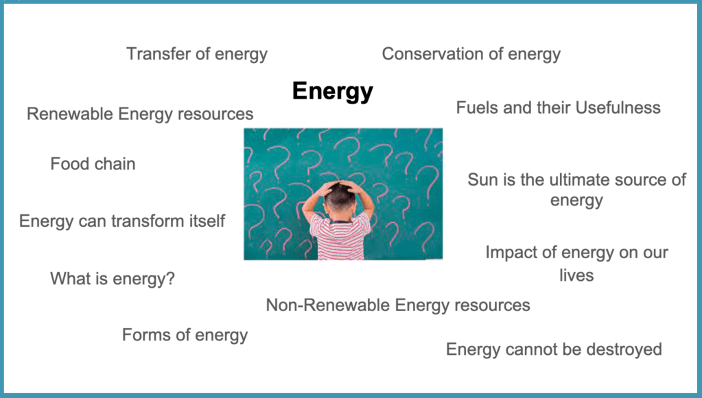 The Dilemma: My students explored several concepts related to energy during the science lessons; What is energy? fuels and their usefulness, non-renewable vs renewable energy resources and use of energy by living things. At the culmination of the unit, the summative task asked an open-ended question, ‘How the Sun’s energy from millions of years ago be transferred to electricity today?’ The results of the task showed that many students could not make sense of or relate to the various ideas of energy and appreciate its impact on our lives.